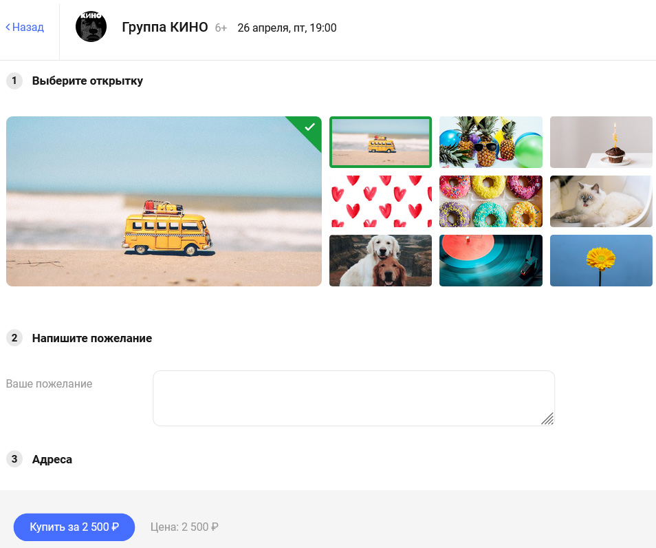 Билеты, открытка и поздравления придут по указанному email-адресу получателя. Электронный чек автоматически отправится покупателю.